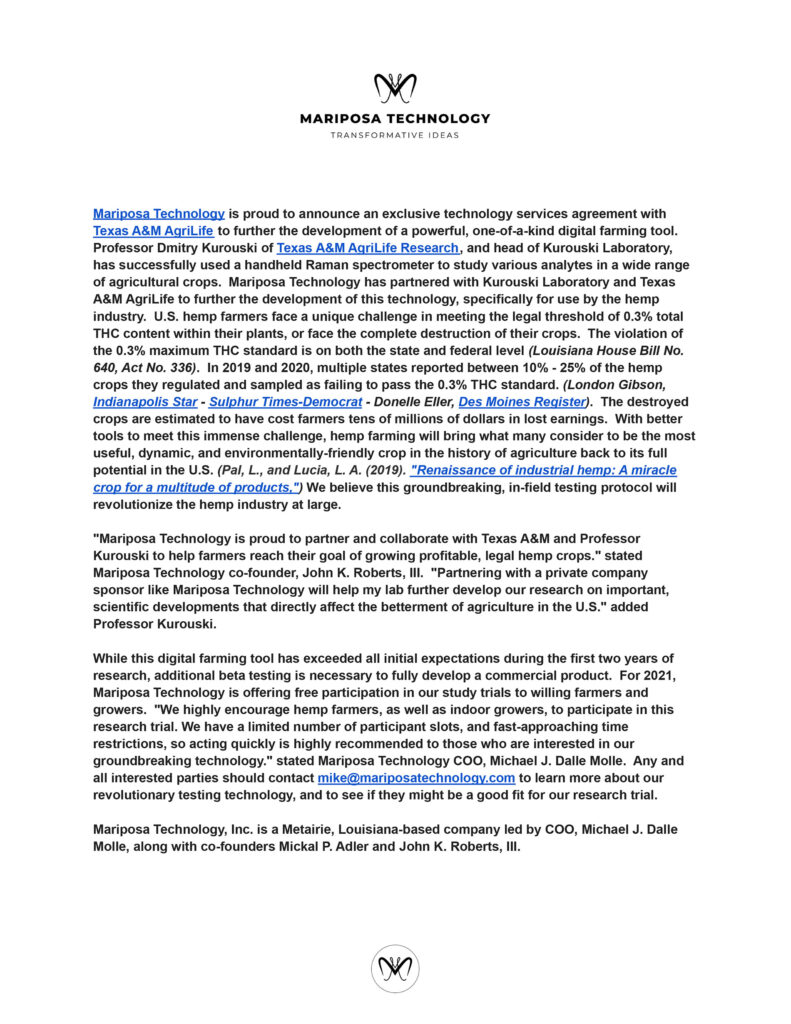 Mariposa Technology is proud to announce an exclusive technology services agreement with Texas A&M AgriLife to further the development of a powerful, one-of-a-kind digital farming tool. Professor Dmitry Kurouski of Texas A&M AgriLife Research, and head of Kurouski Laboratory, has successfully used a handheld Raman spectrometer to study various analytes in a wide range of agricultural crops. Mariposa Technology has partnered with Kurouski Laboratory and Texas A&M AgriLife to further the development of this technology, specifically for use by the hemp industry.